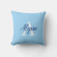 Élégant Monogramme Bleu Calme Script Jetez l'oreiller avec un arrangement élégant de nom et monogramme initial sur un arrière - plan bleu clair. Le coussin est facile à personnaliser en tapant le nom et le monogramme initial de votre choix dans le modèle de personnalisation en ligne avant de commander. Le texte se copie automatiquement de l'autre côté du coussin pour afficher le nom et l'initiale identiques de chaque côté.