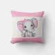 Un coussin avec une jolie illustration d'aquarelle d'éléphant rose. Elle a de jolies oreilles de pois roses et blancs et un joli ruban rose au-dessus de sa tête. Arrière - plan à point Polka.
