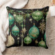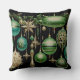 This is an elegant, square Christmas throw pillow set against a stark black background, which makes the decorations truly stand out. The design features a dense arrangement of ornaments and decorations reminiscent of vintage glass baubles, primarily in rich shades of teal/turquoise and emerald green. These ornaments vary in shape, some being smooth and round, others featuring intricate molded details or painted floral accents, mixed with glittering gold and silver star shapes and evergreen sprigs hanging from the top. The overall look is sophisticated and distinctly old-fashioned or antique in style.