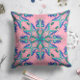 Un coussin rose pastel rêveur avec des détails de mandala turquoises et bleus qui apportent équilibre, joie et une touche d'élégance ludique à votre maison.