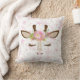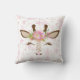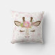 Cette coussin est ornée d'un adorable visage de girafe, décoré de fleurs et feuillage rose et vert tendre. D'un côté du coussin, les yeux de la girafe sont fermés, et de l'autre, ils sont ouverts. De chaque côté, l'image est placée sur un subtil arrière - plan rose et or étoilé.