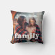 Ce coussin simple et élégant présente deux de vos photos personnelles, ainsi que le mot "famille" dans la typographie moderne blanche boho et un endroit pour ajouter le nom de famille.