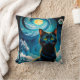 Throw pillow with a fantasy illustration of a black cat against a full moon and blue sky.