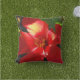 L'image sur cet oreiller extérieur est une photo originale d'une fleur d'hibiscus rouge. Sur la photo, le centre de la fleur est soufflé par un soleil très brillant qui regarde à travers une ouverture entre les feuilles verts jaunes du buisson. L'étamine jaune est entourée des pétales rouges vifs de la fleur, qui semblent jaunes là où le soleil est le plus brillant. Le reste de la fleur tombe dans l'ombre d'une couleur rouge profonde contre les feuilles vert olive.