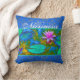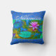 Coussin élégant comportant une fleur rose lumineuse de lotus parmi des lilypads dans un étang et un texte de coutume. Le texte montré ici est le mot Namaste.