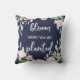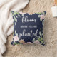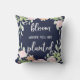 Ce coussin inspiré à la mode et beau indique la "fleur où vous êtes plantés" dans la typographie blanche moderne de manuscrit, avec une guirlande florale de rose d'aquarelle sur un arrière - plan bleu de minuit.