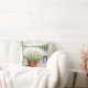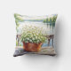 Jetez un joli oreiller avec une belle illustration de fleurs blanches dans un pot en cuivre avec une vue arrière sur un lac serein avec des pins.