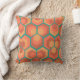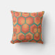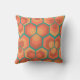 Cet oreiller de lancer a un design géométrique d'hexagones dans des ensembles de trois qui ressemblent à des fleurs en or, orange et rouge sur un champ de turquoise.