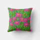 Coussin dans un motif de fleurs sauvages roses fuchsia profonds, aux centres jaunes, dans un champ d'herbe verte