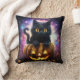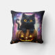 Imaginaire chat noir aux yeux orange sur une lanterne Jack O’éclairée avec un arrière - plan de galaxie violette.