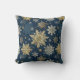 This elegant Christmas throw pillow has a gold and white snowflake pattern against a dark blue background. Perfect for adding a touch of the winter season to your holiday decor.