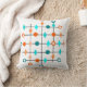 Cet oreiller de lancer a le design moderne du milieu du siècle d'une grille en lignes noires avec des cercles et diamants orange et turquoises.