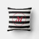 Un oreiller à lancer géométrique moderne avec des rayures noires et blanches et un monogramme rouge.
