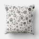 A whimsical black and white seamless pattern throw pillow filled with hand-drawn abstract doodles and playful marks. The design features concentric circles, spirals, dots, dashes, plus signs, and starbursts scattered across a white background. Its lively, modern aesthetic brings a fun and artistic touch to any space.