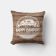 Un coussin de camping simple mais élégant avec la phrase "Happy Campers". Customisez avec votre nom de famille. Présenté avec un arrière - plan rustique en lattes de bois, parfait pour compléter votre décor rustique de camping-car.