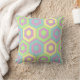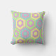 Cet oreiller de lancer a un design géométrique d'hexagones en bleu pâle, jaune pâle et vert pâle sur un champ de rayures en rose pâle et violet pâle.
