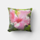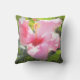 La photographie originale de MaeFlowers sur cet oreiller à lancer de 16 pouces présente une fleur d'hibiscus rose au soleil du matin contre un arrière - plan de feuilles verts. L'un des pétales de fleurs, toujours à l'ombre, est agrémenté de gouttelettes de pluie provenant d'une douche matinale. Les tons roses et verts créent une agréable atmosphère de jardin.