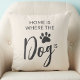 This dog lover's throw pillow features a dog's paw print and reads, "Home is where the dog is" on a beige background.