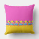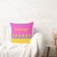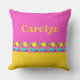 Ce motif stylisé sur un coussin de carré a une frise le long du fond célébrant la vie sur la plage, avec soleil, palmiers, mer bleue et sable doré. Le design est complété par des blocs de couleur rose vif et jaune soleil. Un côté peut être personnalisé avec votre nom. L'oeuvre est un dessin original, unique, dessiné à la main stylisé, numériquement coloré.