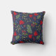 Élégant coussin jeté avec illustration botanique d'automne. Motif lumineux d'érable, houx, gui et genévrier sur fond bleu foncé.