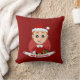 Lancer l'oreiller avec l'illustration d'un mignon garçon caucasien souriant avec de courts cheveux de gingembre, le garçon porte un costume de Père Noël avec un casquette rouge et tenant un cadeau ; dans un cercle rouge sur un arrière - plan rouge, un dessin animé de Noël avec un texte modifiable modèle pour votre nom ou message
