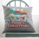 Un trio de mignons bonhommes de neige avec des casquettes et foulards d'hiver festifs, "Joyeux Noël" texte sur arrière - plan gris.