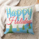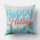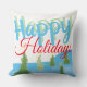 Joyeuses vacances design coussin avec arbres. Les couleurs sont rouges, bleues et vertes. Le texte peut être personnalisé à n'importe quel message.