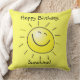 20" x 20" jaune lancer oreiller avec une image d'un soleil jaune souriant et le sentiment optionnel, "Joyeux anniversaire, soleil !" Retour jaune. Voir l'ensemble de la collection de Coussins d'anniversaire dans le DECOR | section Coussin.