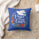 Un élégant oreiller de Noël avec les mots paix sur la terre dans de belles lettres de script. Une couronne fleurie entoure le texte d'une jolie colombe blanche sur un arrière - plan bleu royal. Conçu pour vous par Blackberry Boulevard.