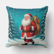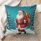 Un joyeux Père Noël portant un sac de cadeaux marche à travers une nuit d'hiver enneigée entourée de pins sous un ciel étoilé magique.