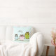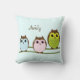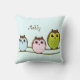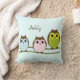 Coussin d'accent de la chambre à coucher de l'enfant mignon fait à un arrière-plan bleu-clair. Les graphiques de bande dessinée un bleu et brun, d'un rose et brun et un hibou vert et brun se reposant sur les branches vertes décore l'avant et le dos du coussin. Personnalisez le texte brun lunatique pour votre pièce d'enfant.