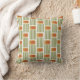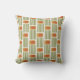 Cet oreiller de lancer a un design moderne du milieu du siècle fait de cinq lignes vertes et un rectangle arrondi doré avec un rectangle arrondi orange répété à travers le design.