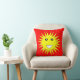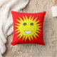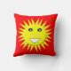 Ce coussin génial est doté d'un soleil jaune vif et souriant qui vous fera sourire même les jours les plus misérables. Il est sur un arrière - plan chaud-rouge et a une grande bouche blanche souriante et d'énormes yeux noirs avec des élèves blancs.