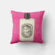 Ce coussin comporte une peinture originale par l'artiste Anne Harwell d'une bouteille de parfum française classique avec le casquette noir sur un arrière - plan coloré par framboise. La conception est sur l'avant et le dos.