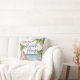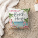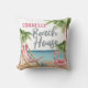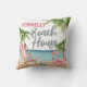 Aquarelle personnalisée Beach House Jetez l'oreiller. Un thème de plage couleur cool aux tons rose et turquoise, qui donne l'ambiance d'une escapade ou d'une escapade sur la plage. Chaise de plage rose et blanc, parasol, et même un flotteur flamand pour plus de plaisir. Des palmiers qui balancent, des coquillages à ramasser, tout est à propos de ces froides villas tropicales. Avec des polices modernes ajoutant une touche de style. Idéal pour une maison de vacances, ou juste si vous voulez apporter une petite ambiance tropicale dans votre maison.