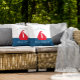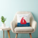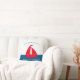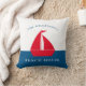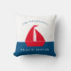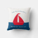 Etonnant oreiller bleu et rouge nautique avec un bateau rouge sur un arrière - plan colorblock blanc et bleu, avec deux modèles texte où vous pouvez ajouter votre nom de famille et maison de bateau, maison d'été ou même chalet, très facile à personnaliser et à faire votre propre. si vous voulez de l'aide avec ce design, alors s'il vous plaît contactez-moi janine à travers mon magasin message bouton willow spring studio et sera heureux de vous aider.