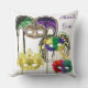 20" x 20" lancer l'oreiller avec une image de quatre masques colorés Mardi Gras ornés de plumes vives, paillettes et parties scintillant sur blanc. Texte facultatif. Dos pourpre. Voir toute la collection de Coussins Mardi Gras dans le DECOR | section Coussin.