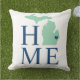 Le coussin de bienvenue élégant présente le texte "Accueil" avec la carte de l'état du Michigan. Le marqueur bleu marine de la ville de coeur peut être positionné sur la ville où vous vivez par la Personnaliser. Couleurs bleu marine, vert jade/menthe et blanc. Un motif à rayures horizontales habille l'arrière du coussin.