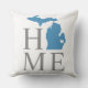 Le coussin de bienvenue élégant présente un design typographique avec le texte "Home" et la carte de l'état du Michigan. Le marqueur de la ville centrale peut être positionné sur la ville où vous vivez par la Personnaliser. Couleurs gris fusain, bleu et blanc. Un motif à rayures horizontales habille le dos du coussin.