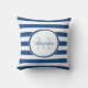 Un carré à la mode, des bandes de bonbons bleu et blanc, jette l'oreiller. Personnalisez ce motif moderne en ajoutant votre nom et votre initiale monogrammée. Ce design monogramme élégant fait partie de la collection de couleurs d'été Classic Blue Stripes.