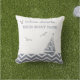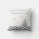 La conception contemporaine de la voile présente des couleurs gris et blanc. L'eau est un motif de zigzag de chevron gris et blanc et le voilier a un motif d'art moderne en ligne dans les voiles. Il y a trois mouettes qui volent au-dessus de la tête. La typographie dit Bienvenue à bord du NOM DE VOTRE BATEAU, que vous personnalisez avec le bouton à droite. L'arrière du coussin est le motif en chevron gris et blanc pour changer. Un amusant coussin pour habiller votre bateau ou votre plage à la maison.