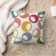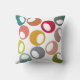 Cet oreiller de lancer a un design moderne du milieu du siècle avec des cercles dans les tons rétro de bleu, violet, rose, marron, citron vert et or avec des ovales blanches.