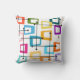 L'oreiller à jetons a une conception de rectangles qui sont étirés sur une extrémité dans des couleurs super, orange, vert, turquoise, violet, bleu, rose et jaune avec des lignes atomiques qui les sillonnent.