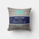 Découvrez ce cool extérieur moderne maison de plage nautique turquoise bleu design jetez oreiller. Les deux côtés du coussin ont un crabe turquoise sur la partie supérieure et l'expression "bienvenue à notre maison de plage" en calligraphie blanche et tendance écrit à la main en lettrage au centre de la bande horizontale bleu marine. Votre nom de famille personnalisé et votre année d'établissement sont dans la partie inférieure. CLIQUEZ SUR L'OPTION "PERSONNALISER LE MODÈLE" ET SUIVEZ LES PROMPTS.