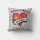 Ce coussin est doté d'un coeur de style tatouage coloré d'un design fractal orange et rouge. Le coeur est orné d'une bannière à ruban. Il y a deux noms ci-dessus et une date sur la bannière pour vous de personnaliser. Texte ci-dessous : "Pour toujours".