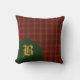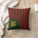 Coussin élégant de plaid fait dans le motif traditionnel de tartan de clan de Bruce de vert, de rouge, de blanc, et le jaune. Un secteur circulaire vert, dans en bas à gauche l'avant, a un monogramme d'or de lettre du jaune un prêt à personnaliser avec votre initiale de famille. Carreau beau d'accent avec un motif et un monogramme classiques.