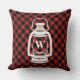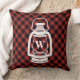 Un coussin comportant un motif rouge et noir de plaid d'héritage (buffle) sur l'avant et le dos. L'avant comporte une illustration blanche d'une lanterne de camping d'huile. Personnalisez l'initiale sur la lanterne.