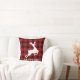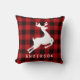 Le coussin d'accent de vacances carré dispose d'un monogramme de votre nom de famille (ou autre texte) avec un cadre à motif de buffle rouge et noir et une silhouette de rennes blancs.