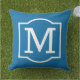 Un coussin d'extérieur audacieux présentant une initiale de monogramme blanc à l'intérieur d'un cadre entre parenthèses décoratif sur un fond bleu cobalt vibrant. La lettre serif surdimensionnée et la bordure crantée élégante créent un accent prépa saisissant pour les sièges au bord de la piscine, les meubles de patio ou les chaises de terrasse. L'initiale est entièrement personnalisable.