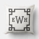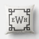 Un oreiller classique avec un monogramme personnalisable à trois lettres à l'intérieur d'une bordure géométrique Clé Grecque noire sur fond blanc. Le design noir sur blanc croquant apporte une touche intemporelle et chic à n'importe quelle pièce. Personnalisez avec vos initiales ou le monogramme d'un couple pour un cadeau élégant et personnalisé.